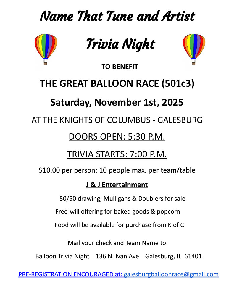 Here is the 2025 SCHEDULE OF EVENTS for the Great Balloon Race at Lake Storey Park, Galesburg, IL (soccer fields – just west of baseball fields)